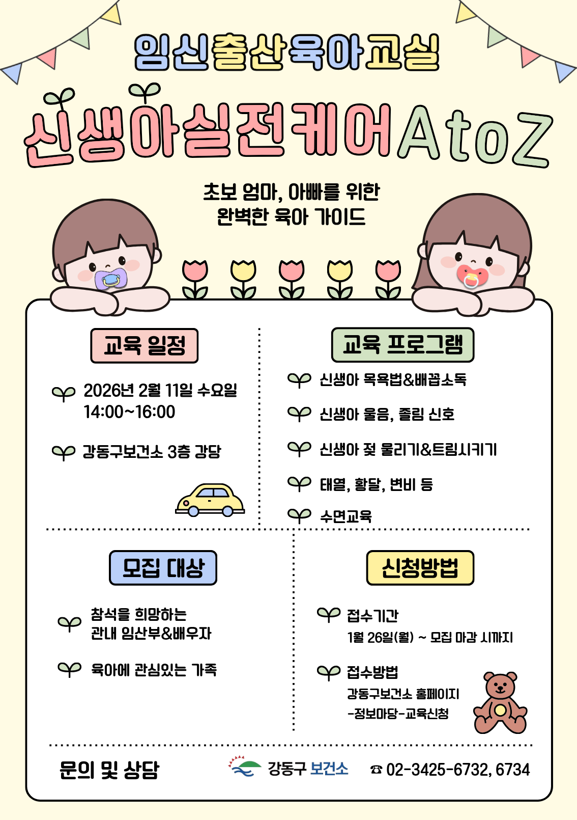 건강상담 게시글 확인 작성부서 건강증진과 전화번호 작성일 2026.01.20 조회수 220 제목 2026년 2월 임신•출산⬝육아 교실 참여자 모집-마감 ※ 주차비는 지원되지 않습니다. 첨부파일 목록