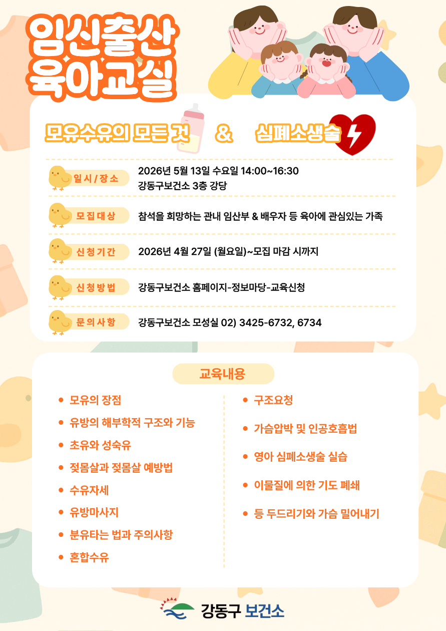 | 제목 | 2026년 5월 임신⬝출산⬝육아 교실 안내(모유 수유 & 심폐소생술) | ||