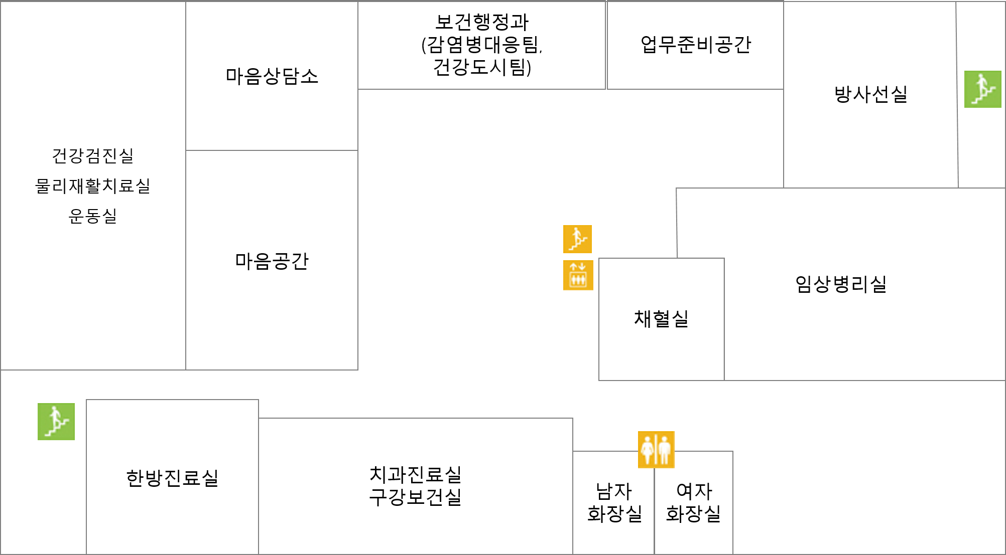 청사안내 청사배치도 1층 화장실 엘리베이터 계단 비상계단 2층 화장실 엘리베이터 계단 비상계단 3층 화장실 엘리베이터 계단 비상계단 지하 1층 화장실 엘리베이터 계단 비상계단 담당부서보건행정과 보건기획팀 문의02-3425-6600 최종수정일 2025-10-15 이 페이지에서 제공하는 정보에 대하여 만족하십니까? 매우만족 만족 보통 불만족 매우불만족 평가하기 확인 한줄의견 저장